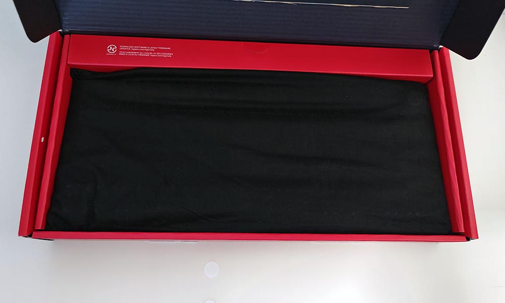 - Boîte sobre, noire avec un visuel clair du clavier en action sur la face avant. Le packaging reste minimaliste, sans fioritures inutiles.