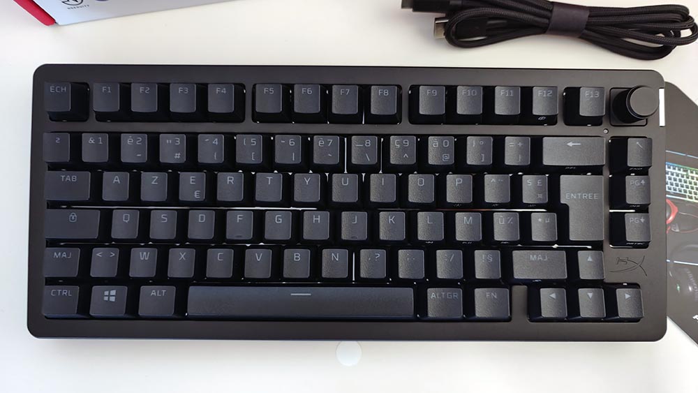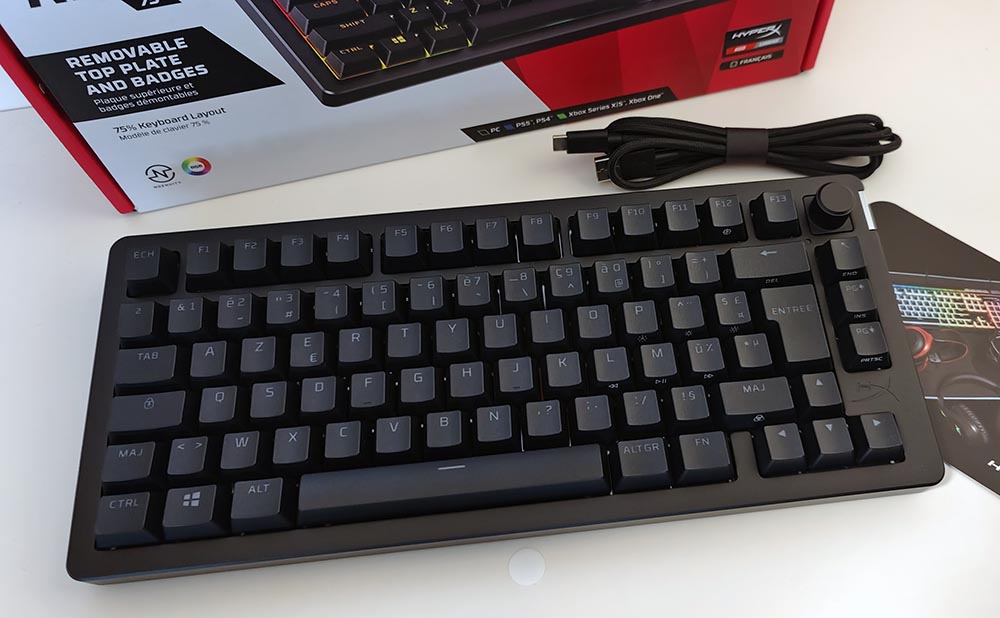 - Clavier HyperX Alloy Rise 75 Wireless, déjà monté et prêt à l’emploi protégé dans sa housse noire.