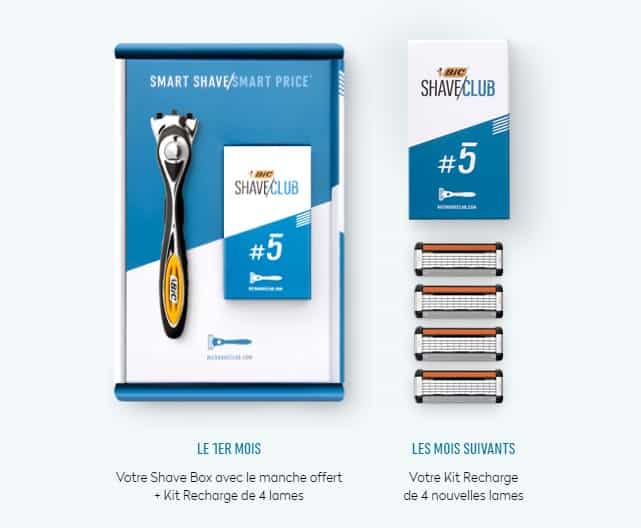 BIC s’invite dans le marché des box à raser, avec le Bic Shave Club et propose dans un abonnement sans engagement un kit de rasage rechargeable (à partir de 1,25€ la recharge de lame).