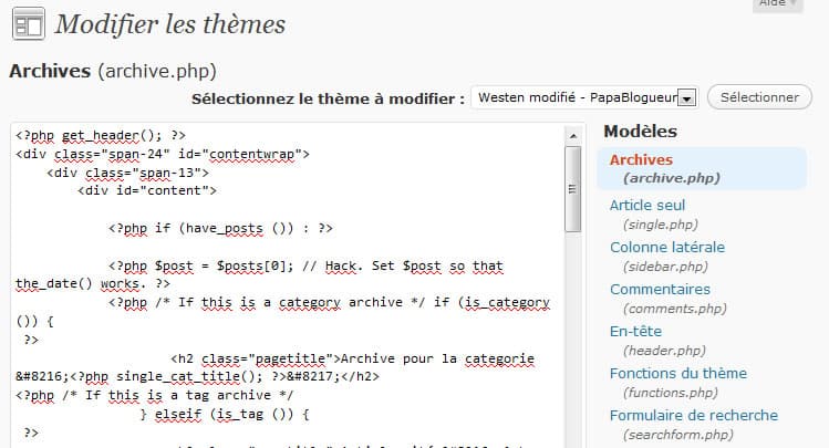 Avant toute chose, il faut savoir qu’il est possible de modifier les pages de votre thème directement depuis l’admin de WordPress. C’est peut-être le plus simple mais en même temps le plus basique.