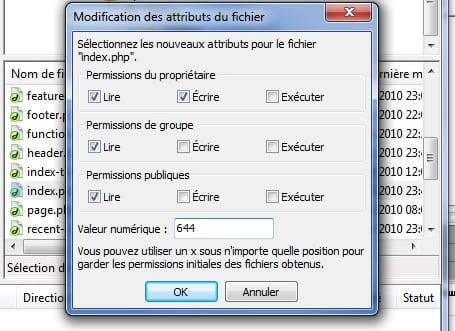 Modifier la donnée : ‘valeur numérique’ par 666 pour donner les droit de lecture et d’écriture nécessaires à WordPress. Ensuite cliquer sur OK. Vous pourrez alors modifier à loisir vos fichiers dans l’admin de WordPress.