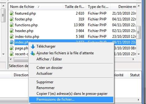 Votre logiciel FTP (Filezilla par exemple) vous permet de configurer les permissions des fichiers et dossiers sur votre serveur. Cette fonction est souvent appelée Propriété / CHOMD ou Attributs de fichiers.