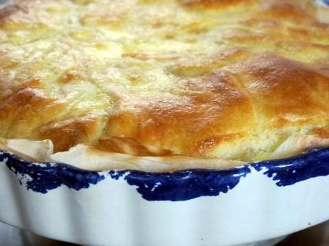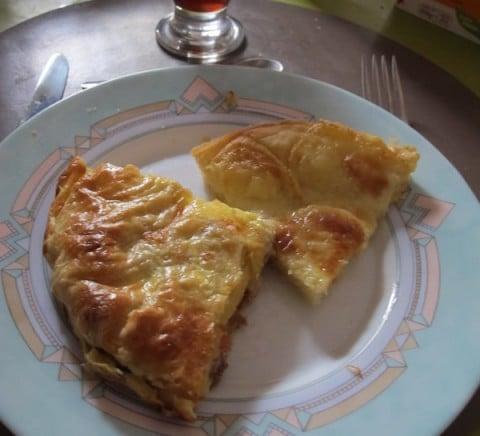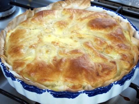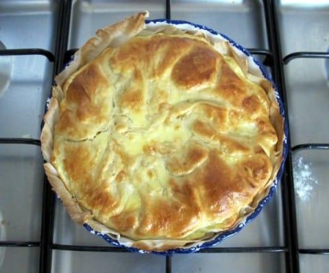 Un midi riche en fromage de saison. La tourte est réalisée avec de la viande hachée sur le fond de pâte, surmonté d’un émincé de légumes (les restes) et d’une couverture de reblochon. COmme mon plat n’est pas prévu pour la taille de la pâte, j’ai recouvert la préparation du surplus de celle-ci que j’ai doré à l’oeuf.