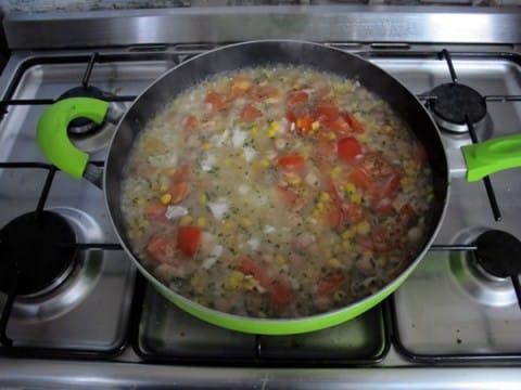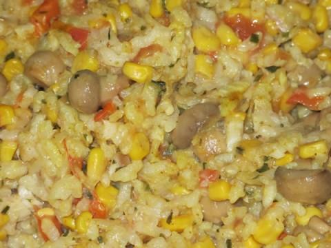 Faire fondre le beurre, puis dorez 1 oignon émincé, ajoutez le riz et laissez cuire jusqu’à ce qu’il soit translucide, tout en remuant. Ajoutez l’eau, les légumes (ici de la tomate fraîche, du maïs et des champignons surgelés) et la viande de votre choix (dans notre cas du poisson blanc sans arrête).