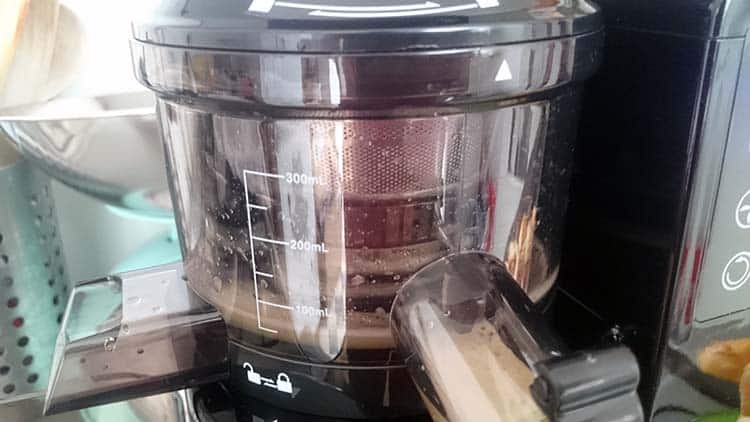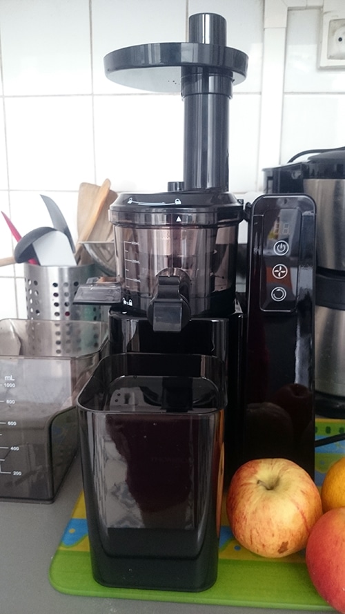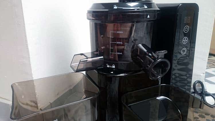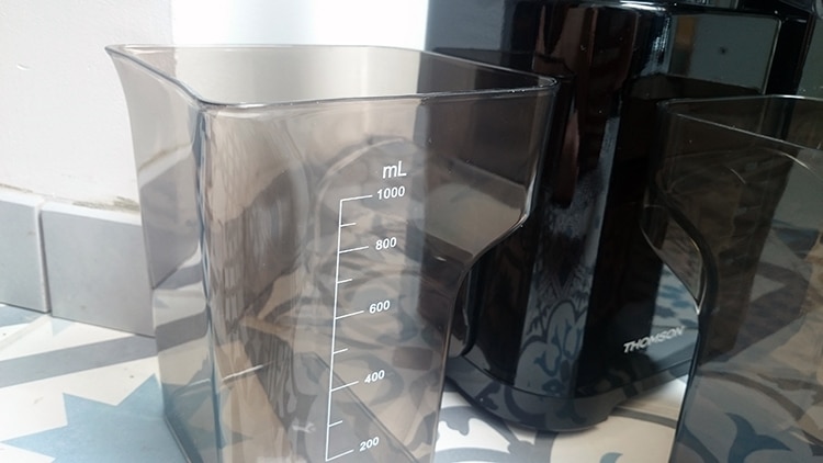 Le jus d’ailleurs coule sur la face où il y a les boutons ONN/OFF (et autres options), tandis que les déchets se font dans l’axe transversale. Le récipient à jus gradué et l’autre forcément, pour les déchets. Mais même si on se trompe, ce n’est pas bien grave.