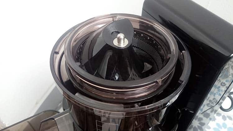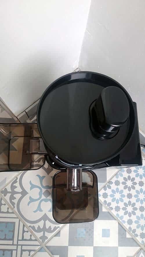 Au déballage de l’appareil, il y a plein de pièces, c’est un peu le mode Puzzle car la notice pêche un peu de ce côté là. Mais avec un peu de jugeote, en regardant la photo sur le carton, tout finit par rentrer dans l’ordre. N’oublions pas de clipser le bouchon au bout du tuyau de réception du jus. Très utile pour changer de récipient s’il est plein.