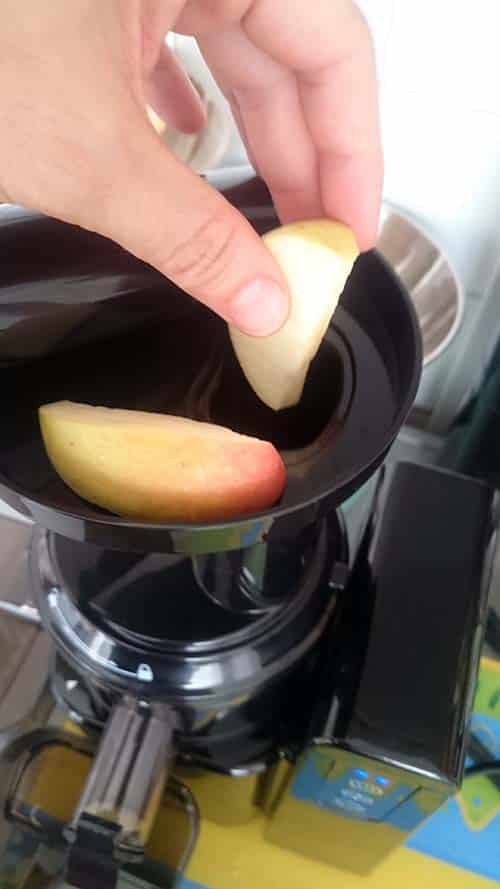 Question utilisation. Une fois les fruits lavés, l’orange épluché, les noyaux et pépins supprimés, il suffit de les ajouter dans le trou supérieur et d’appuyer dessus avec le poussoir fourni. Attention à ne pas aller trop vite par sécurité.