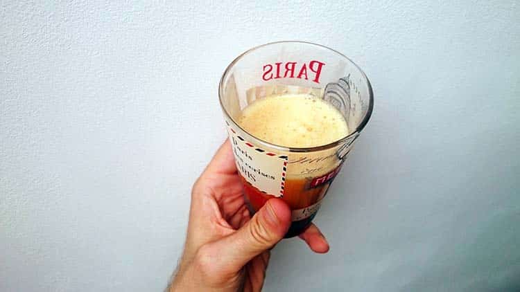 Le jus est liquide peut-être un peu trop épais selon les choix de fruits/légumes, rien n’empêche de rallonger avec de l’eau (pas de sucre surtout). A consommer rapidement pour garder les vitamines et à mettre au frais ensuite (consommation dans les 12h00). A savoir, le pressage des fruits/légumes à basse vitesse par un extracteur de jus limite l’introduction d’oxygène dans la préparation et augmente la durée de conservation du jus ou des préparations.