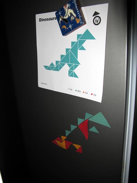On choisit ensemble un des multiples dessins à réaliser à partir des magnets en forme de triangle (petit : 1 point, moyen : 2 points et grand : 4 points) et on le fixe au frigo. Puis en fonction des corvées réalisées, la reproduction en famille du modèle se fait petit à petit. Posez aussi visible, la liste des points / tâches, c’est plus facile pour tout le monde se retrouver.