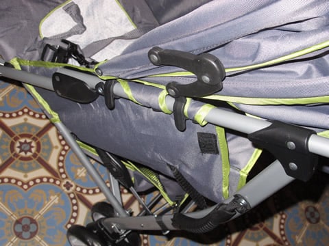 D’ailleurs, à ce sujet, c’est pas très compliqué, il suffit juste d’appuyer sur la manette, de tirer vers soi et hop, ça se ferme tout seul? On clipse le côté droit et on porte la poussette par la poignée à gauche. D’ailleurs en parlant de cette poignée, comme elle est assez grande, Mr Moyen a trouvé tout de suite l’utilité de la tenir pour marcher dehors aux côté de Madame Maman, double effet KissCool ! mdr