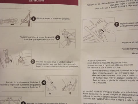 Une fois la poussette déballée, la première chose à faire, lire la notice. Si ! Si ! Faut pas passer à côté. En plus, elle est petite et simple. donc même vous, messieurs, n’aurez pas de mal à suivre. lol