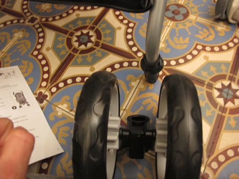 Là on se rend compte qu’il n’y a pas de roues avant, no panic ! Si tu as lu la notice AVANT, c’est marqué dessus, faut les emboîter toi-même comme un(e) grand(e). Après un petit clac bien singulier, les voilà en place. Profites-en pour tester les petits clapets qui permettent d’empêcher les roues avant de la poussette de tourner.
